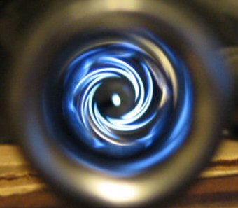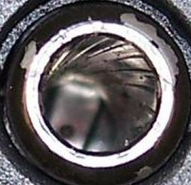 The hole in the barrel is not round, and the shape rotates down the length of the barrel. (These barrels are typically cold-hammer forged over a mandrel.) The shape lets the barrel grab hold of the bullet and spin it as it goes down the barrel. The gas seal is about perfect and the friction very low by comparison. Polygonal rifling varies, but the P7's version is completely smooth and mirror-like down the full length of the barrel. It's actually sort of like a twisted mirror inside and hard to take a photograph of. This is one try: