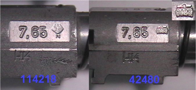 HK enthusiasts and books will tell you that HK only uses one Proof House, the Ulm, Germany. Here are images of two .7.65mm barrels, one proofed at Ulm (with stag horn on left) -- the other not! Early HK4 barrels were not proofed at Ulm.