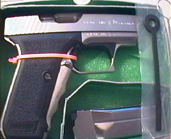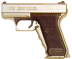 The P7M10 shares recievers with the P7M13, but fires a .400 caliber bullet from the .40S&W cartridge, requiring a 12.64oz heavier slide. This results in a overall height identical to the 1911, yet retains the low muzzel flip, light recoil, and sizzling slide velocities of the 9mm P7's. It has a regular (lands & grooves) barrel, and has a double-stack Magazine that holds 10 rounds. This gives it a wider grip similar to the P7M13. At 2.69 lbs., it is considerably heavier than the rest of the P7's.