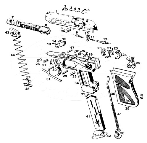 1 Slide (Note #1 Below) 2 Extractor (Note #1 Below) 3 Set Bolt 4 Compression Spring 5 Rear Sight 6 Safety 7 Recoil Spring (Note #1 Below) 8 Barrel (Note #1 Below) 9 Cylinder Head Screw (Note #1 Below) 10 Face Plate 11 Firing Pin Spring (Note #1 Below) 12 Firing Pin (Note #1 Below) 13 Plunger Spring (Note #1 Below) 14 Plunger 15 Stop Pin 16 Barrel Clamp 17 Barrel Clamp Cylindrical Pin (Note #1 Below) 18 Ejector (Note #1 Below) 19 Ejector Spring (Note #1 Below) 20 Sear (Note #1 Below) 21 Spring Support 22 Drag Spring 23 Disconnector Spring 24 Disconnector 25 Hammer 26 Buffer Plate (Note #2 Below) 27 Buffer (Note #2 Below) 28 Elbow Spring (Note #1 Below) 29 Trigger (Note #1 Below) 30 Trigger Cylindrical Pin 31 Trigger Bar 32 Ejector Cylindrical Pin 33 Hammer Pin (Note #1 Below) 34 Receiver 35 Magazine Catch Cylindrical Pin 36 Spring Rod 37 Mainspring (Note #1 Below) 38 Magazine Catch 39 Grip 40 Grip Screw, Countersunk, Lens Head (Note #1 Below) 41 Magazine Assembly 42 Magazine Bottom (Note #1 Below) 43 Follower 44 Follower Spring 45 Locking Plate Assembly Some of these parts are still available at e-gunparts.com